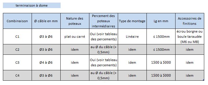Il existe différentes méthodes pour fixer un câble inox, voici par exemple plusieurs schéma de montage ainsi que le tableau des combinaisons.